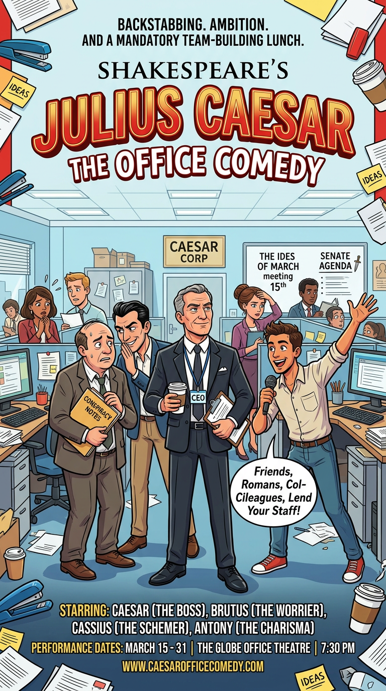 When Julius Caesar returns from a wildly successful acquisition, the office is buzzing with rumors that heâs about to promote himself to âExecutive Emperor.â Concerned about the future of the company (and their own job titles), a group of executives led by Cassius recruits Brutus to âfixâ the situation.